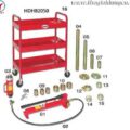 * Tất cả các chi tiết của dụng cụ được đặt trên xe đẩy 3 khay thuận tiện khi sử dụng và bảo quản. Bao gồm 16 chi tiết sau đây: 1.Bơm tay thủy lực 2 cấp tốc độ; 2.Ống thủy lực dài 5'; 3.Benz thủy lực 20 tấn, hành trình 5″”; 4.Tuýp nối 27.5″”; 5.Tuýp nối 20″”; 6.Tuýp nối 10″”; 8.Chốt khóa 5″”; 9.Khớp nối (đực); 10.Ly hợp ren;Bệ ti ben; 12.Ngón nâng; 13.Đầu V; 14.Đầu hình nêm; 15.Ti ren; 16.Xe đẩy 3 khay.